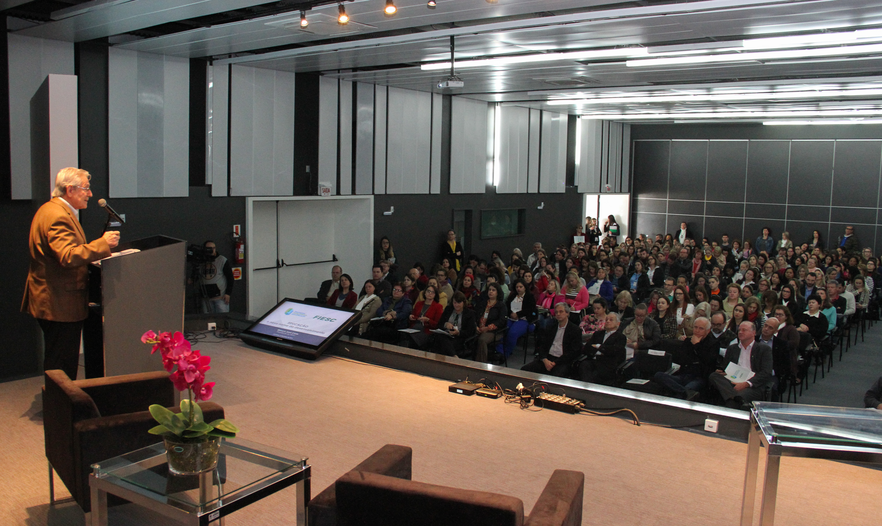 O vice-presidente regional da FIESC Diomício Vidal ressaltou a grande presença de público, que lotou o auditório da Associação Empresarial de Criciúma. “É uma mostra de que queremos aprender”, disse, lembrando a importância de os participantes levarem as informações do evento para as escolas.