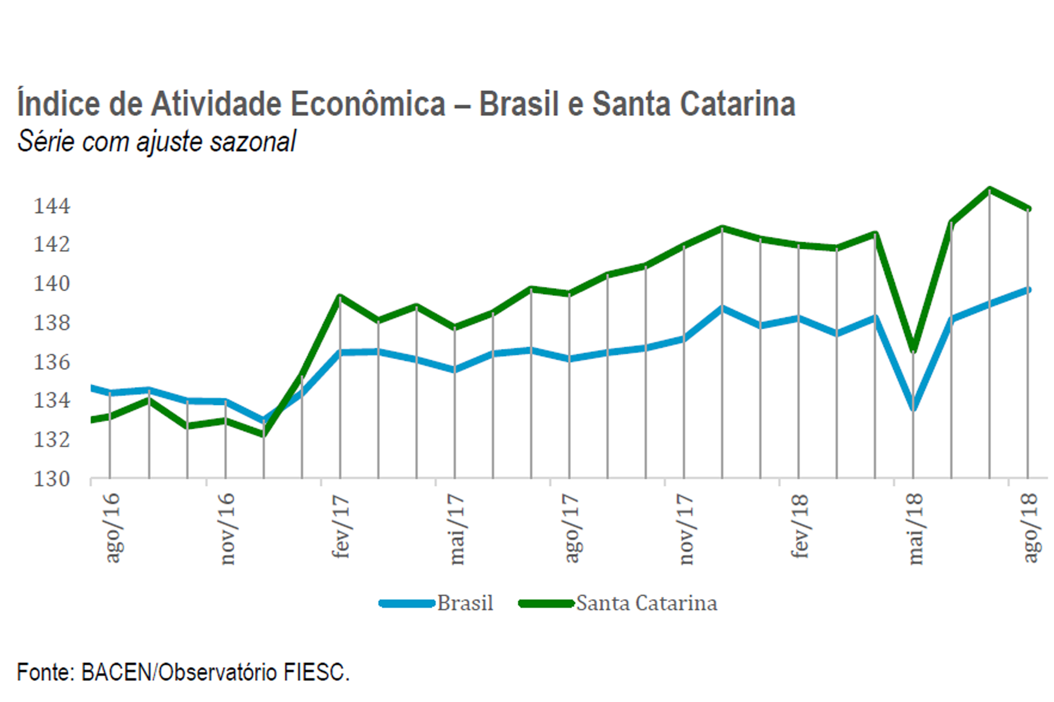 Florianópolis, 19.10.2018 – O Índice de Atividade Econômica Regional de Santa Catarina (IBCr-SC) recuou 0,06% na passagem de julho para agosto. O indicador, considerado uma prévia do PIB, é calculado pela Banco Central e foi divulgado pelo Banco Central. No acumulado do ano até agosto, a atividade econômica registra crescimento de 2,8%. Clique aqui e veja a análise completa.