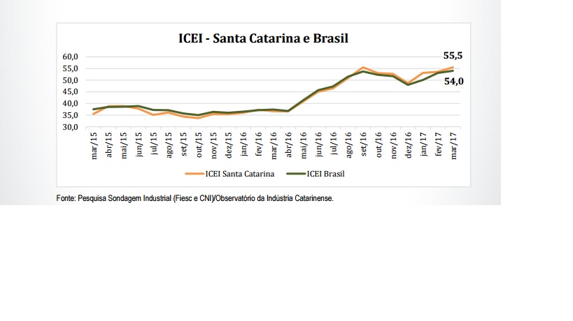 Florianópolis, 17.3.2017 - As expectativas dos industriais catarinenses mantiveram-se otimistas em março e alcançaram (55,5 pontos), ampliando-se a trajetória de crescimento iniciada em dezembro, mostra a pesquisa Índice de Confiança do Empresário Industrial (ICEI), realizada pela Federação das Indústrias de Santa Catarina (FIESC). O índice varia no intervalo de 0 a 100. Acima de 50 pontos indica confiança e abaixo, falta de confiança na economia. Segundo o levantamento, o desempenho reflete um quadro macroeconômico menos dramático, com expectativa de estabilização da renda nacional, grande redução dos níveis de inflação e das taxas de juros, além da valorização do real.