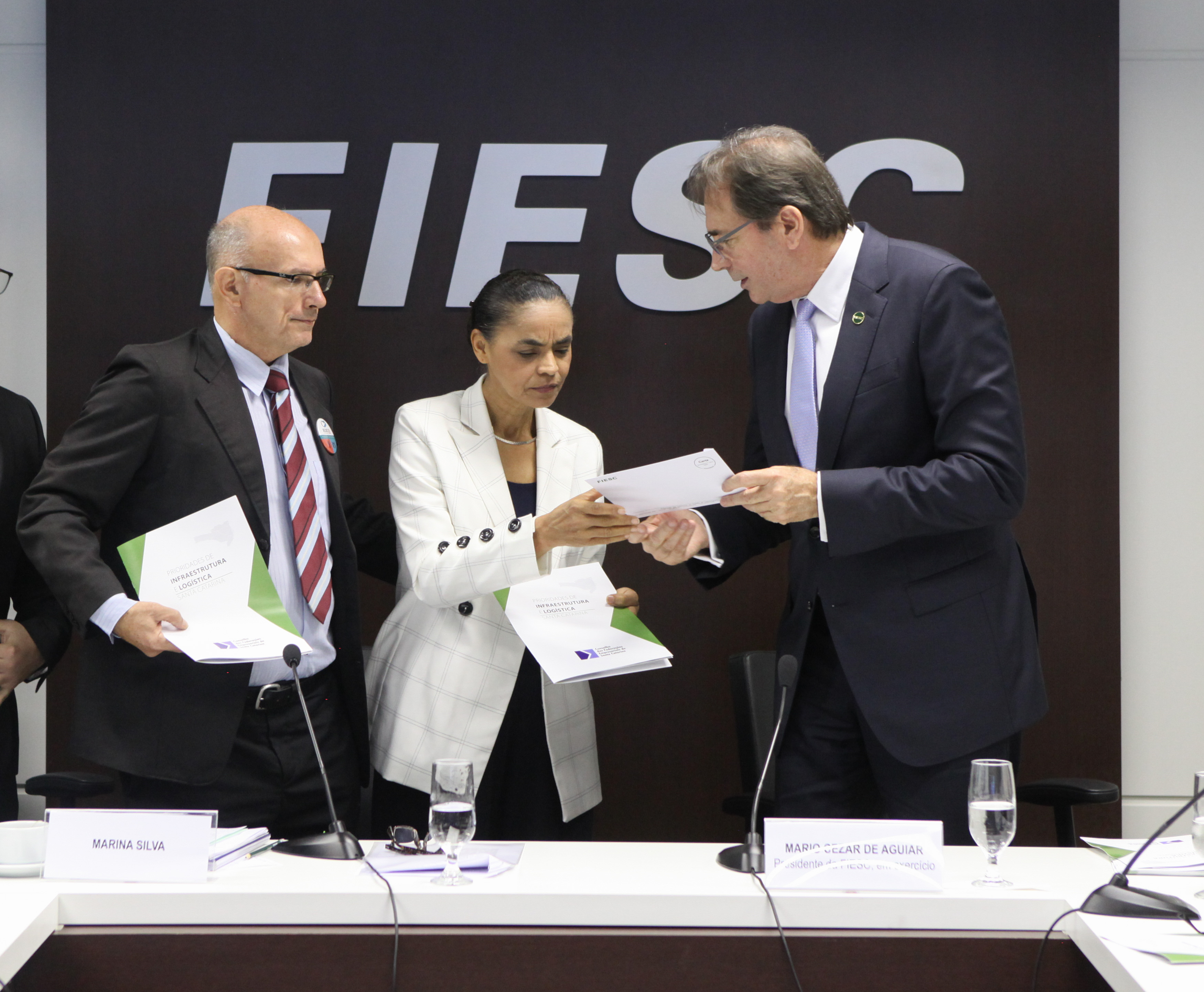 – O setor empresarial de Santa Catarina entregou à pré-candidata à presidência da República, Marina Silva, documento com seis demandas do Estado que contemplam as prioridades nas áreas de infraestrutura, logística e energia. Ela participou de encontro com representantes do Conselho das Federações Empresariais de Santa Catarina (COFEM), na manhã desta quinta-feira (19), na Federação das Indústrias de Santa Catarina (FIESC), em Florianópolis. Clique aqui e veja a íntegra do documento com as propostas.