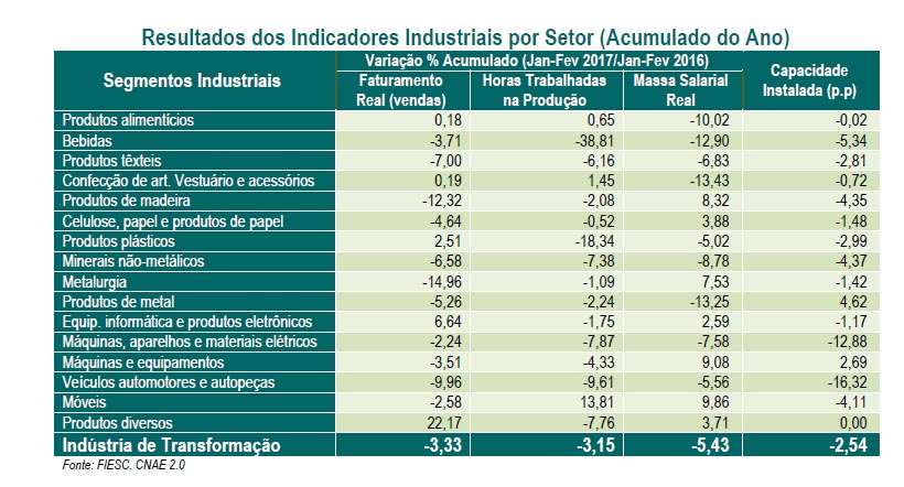 No mesmo período, ocorreram variações positivas nos segmentos: produtos diversos (22,1%), equipamentos de informática e produtos eletrônicos (6,6%), produtos plásticos (2,5%) e confecção de artigos do vestuário e acessórios (0,19%). Ainda nos dois primeiros meses do ano em relação ao mesmo período no ano passado, a massa salarial real diminuiu 5,43%, as horas trabalhadas na produção contraíram 3,15% e a capacidade instalada na produção se reduziu 2,5%.