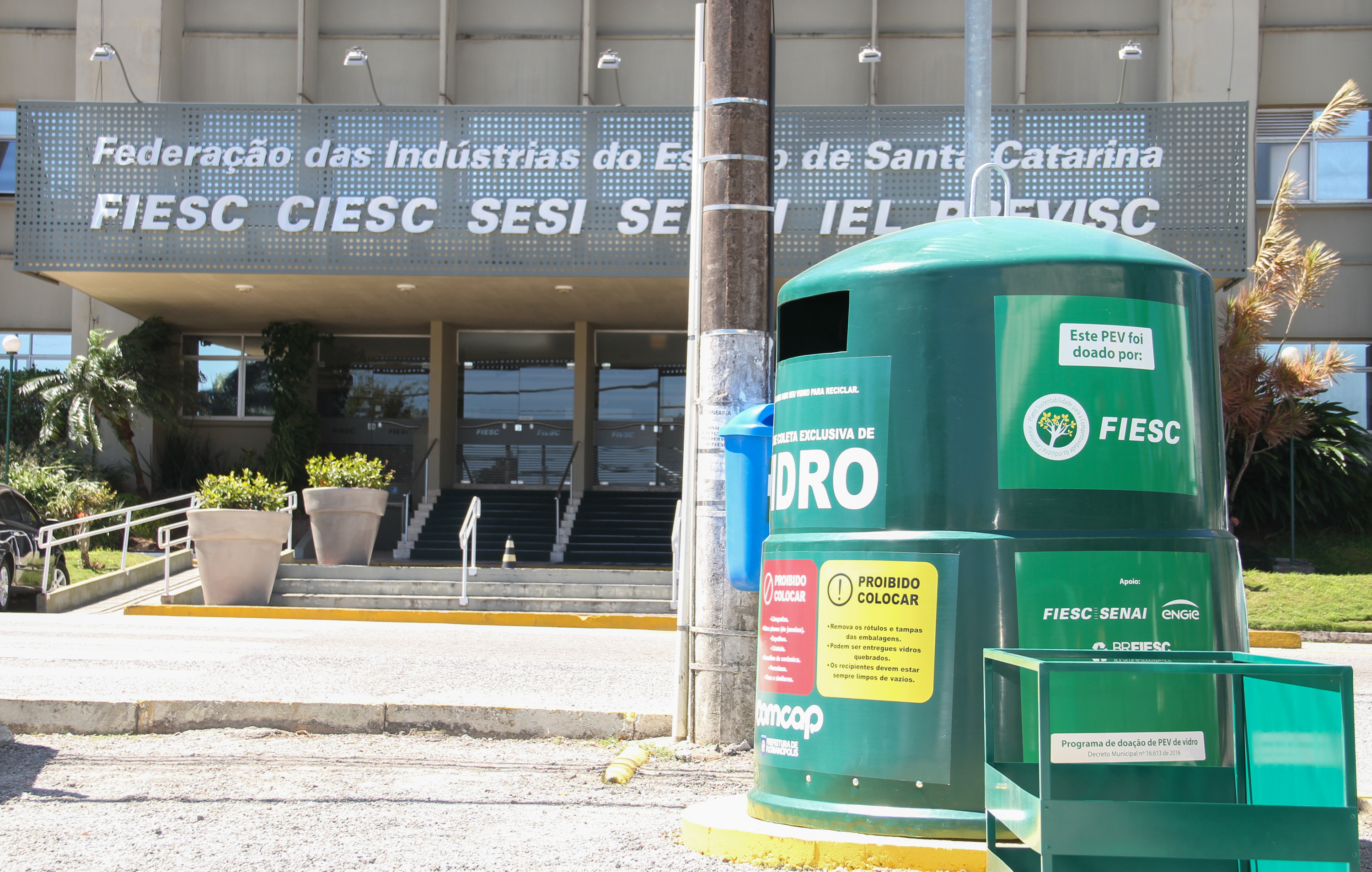 Florianópolis, 21.9.2016 – A FIESC aderiu ao programa municipal de doação de mobiliário para limpeza urbana, com a instalação do ponto de entrega voluntária (PEV) para vidro em frente à sede da instituição, em Florianópolis. Com a doação, a entidade auxilia a Companhia Melhoramentos da Capital (Comcap) a expandir para o bairro Itacorubi a rede de PEVs de Vidro que hoje opera na região continental da cidade. A iniciativa estimula a indústria a cuidar da logística reversa e o cidadão a separar as embalagens de vidro para a reciclagem. A ação faz parte do Plano de Sustentabilidade para a Competitividade da Indústria Catarinense.
