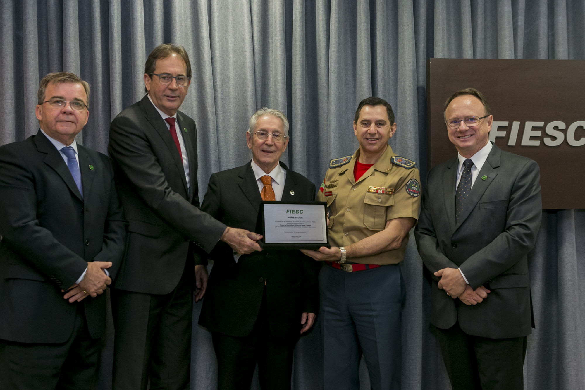 Florianópolis, 18.8.2017 – A Federação das Indústrias de Santa Catarina (FIESC) homenageou o Corpo de Bombeiros Militar de Santa Catarina pela relevância da corporação para a vida e o bem-estar dos catarinenses. O reconhecimento foi prestado em reunião de diretoria da Federação, nesta sexta-feira (18), em Florianópolis. A instituição militar está presente em 132 municípios no Estado, com um efetivo de 2.240 profissionais. Em 2016, foram atendidas mais de 193 mil ocorrências. A corporação foi criada em 1919, por lei sancionada pelo governador Hercílio Luz. Seria constituída de integrantes da Força Pública, como era chamada a Polícia Militar naquela época. Em 26 de setembro de 1926, foi inaugurada a primeira sessão do Corpo de Bombeiros de SC.
