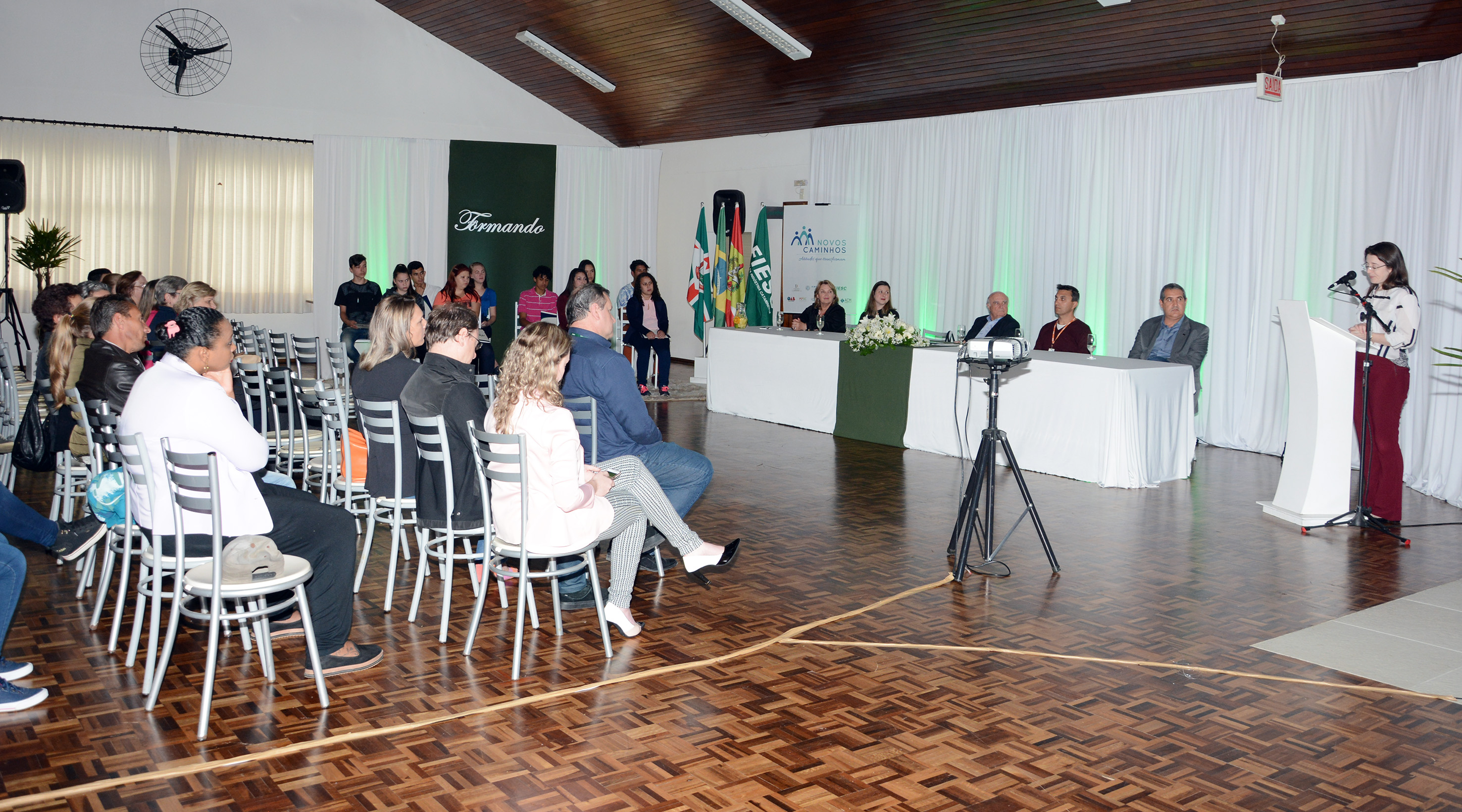 Florianópolis, 20.11.2018 – Adolescentes do Planalto Norte atendidos pelos serviços de acolhimento de Santa Catarina participaram na segunda (19) da solenidade de formatura no Programa Novos Caminhos. O projeto qualifica e profissionaliza os adolescentes, preparando-os para a vida autônoma. Foram dez os formandos neste ano, das cidades de São Bento do Sul, Rio Negrinho, Campo Alegre e Mafra.