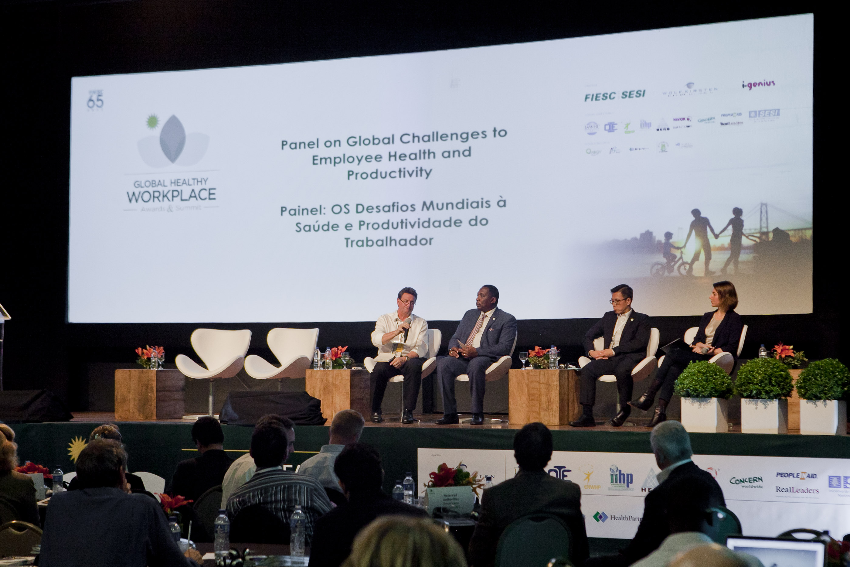 Florianópolis, 18.05.2015 – Empresários e lideranças industriais discutiram nesta segunda-feira (18) os desafios mundiais com relação à saúde e produtividade dos trabalhadores. O painel de debates, promovido no evento Global Healthy Workplace Awards and Summit, contou com a presença dos especialistas Stephen Bevan, do Reino Unido; Sim Beng Khoon, de Singapura; e Richard Kasesela, da Tanzânia.